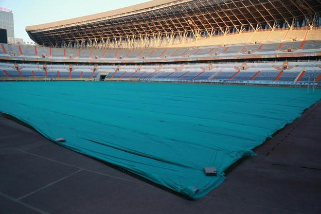 为保证草皮温暖过冬,济南奥体中心在冬季为球场铺上无纺布保暖