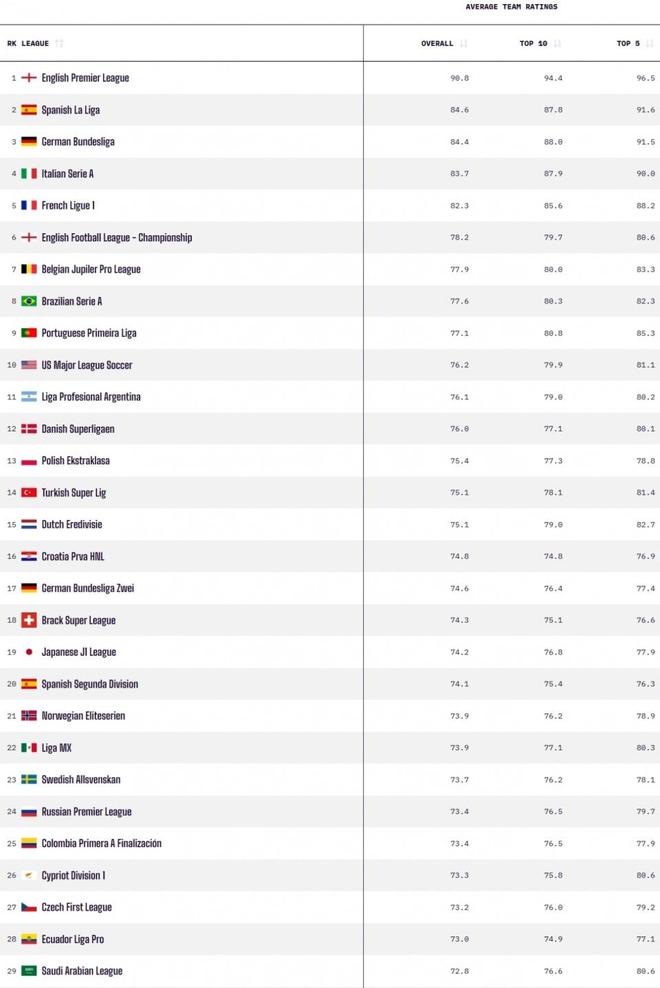 值得注意的是,英格兰第2级别联赛“英冠”联赛竟然位居第6位,力压比甲、巴甲、葡超等其他传统足球强国的一级联赛。而梅西所效力的美职联,则排名第10位。